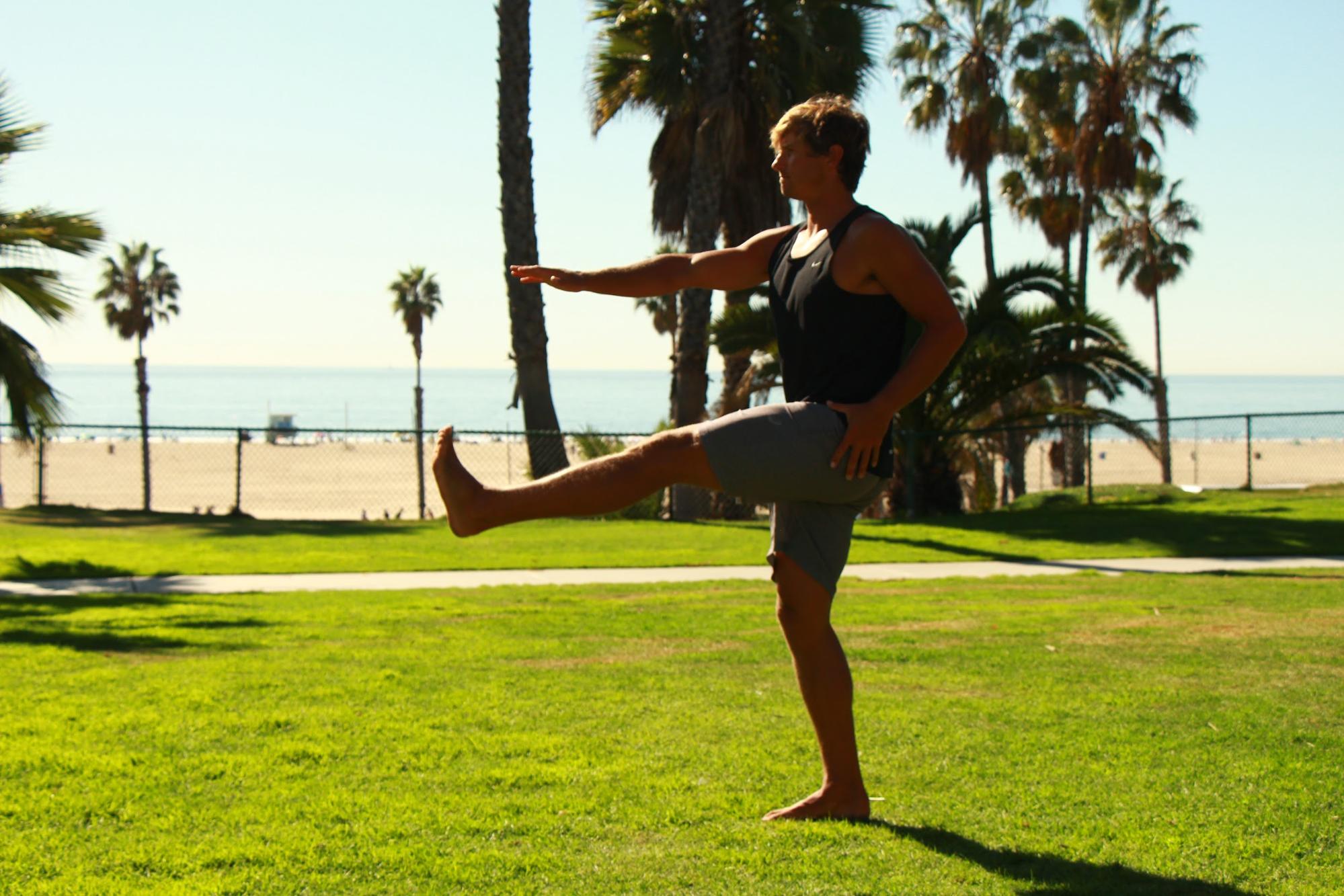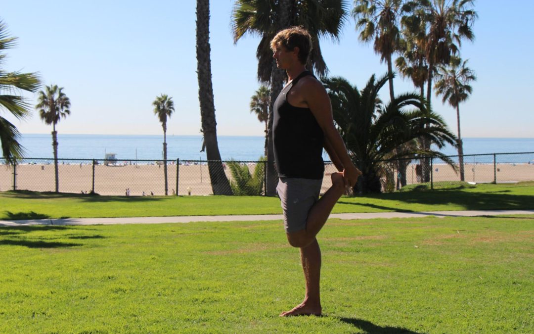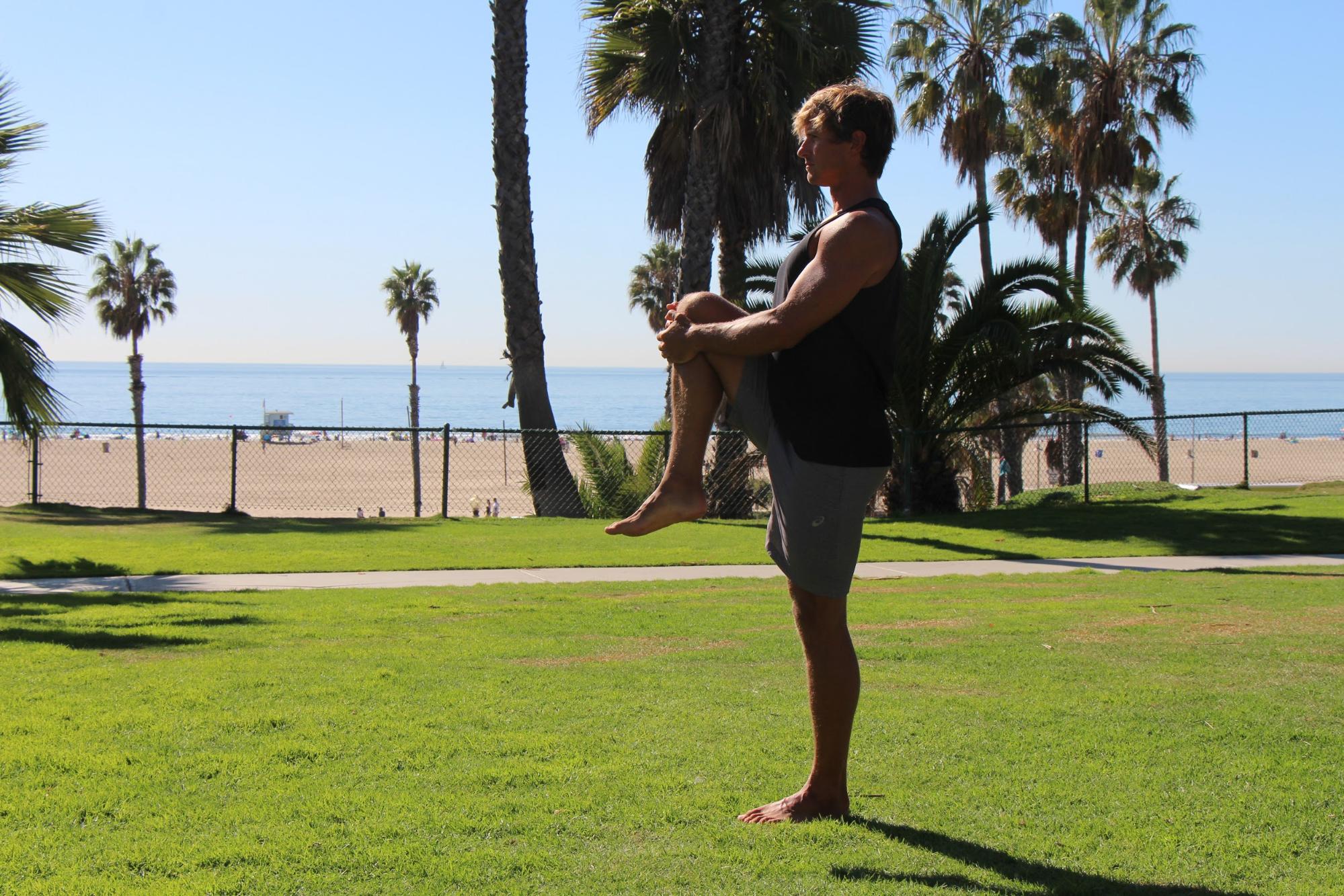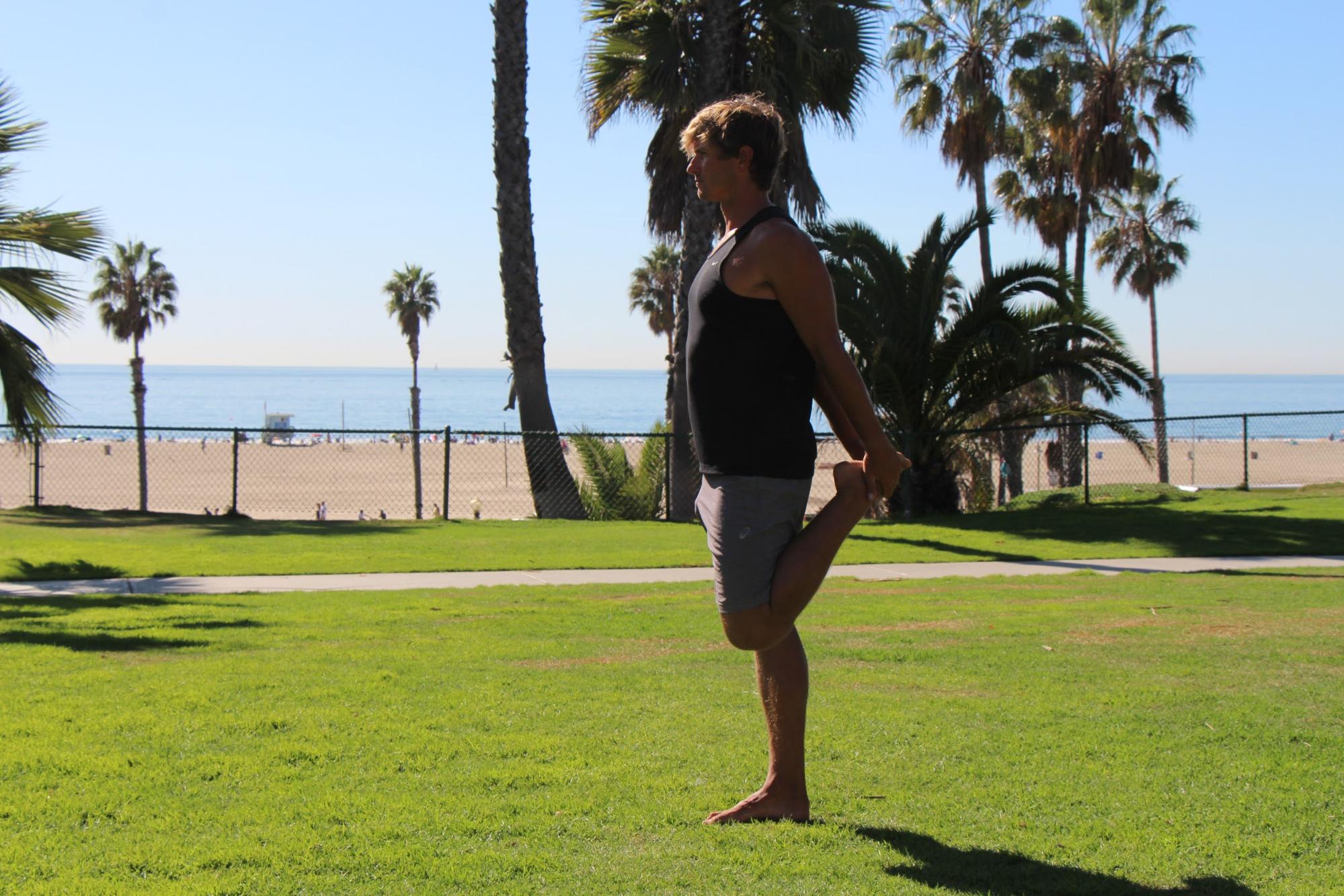 This stretch puts a dynamic twist on a long-time favorite. The quadriceps muscle is crucial to explosiveness, and this will help you loosen it up.